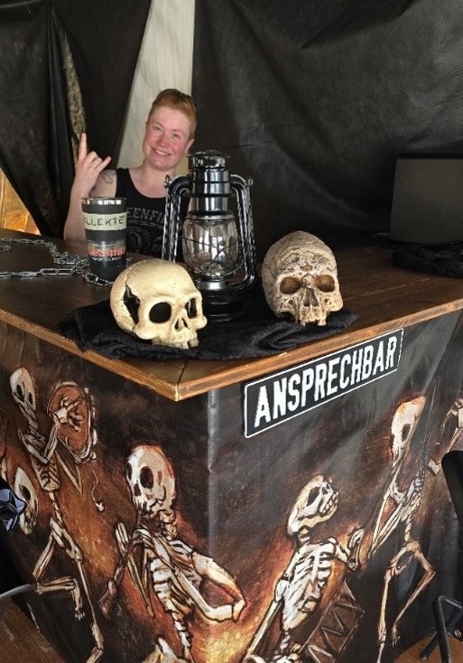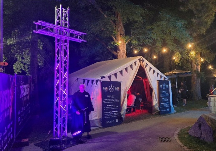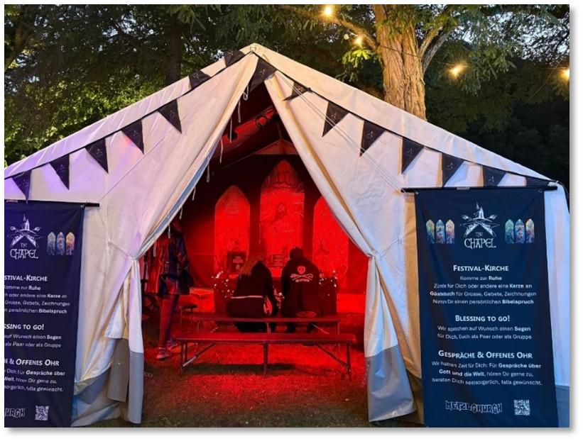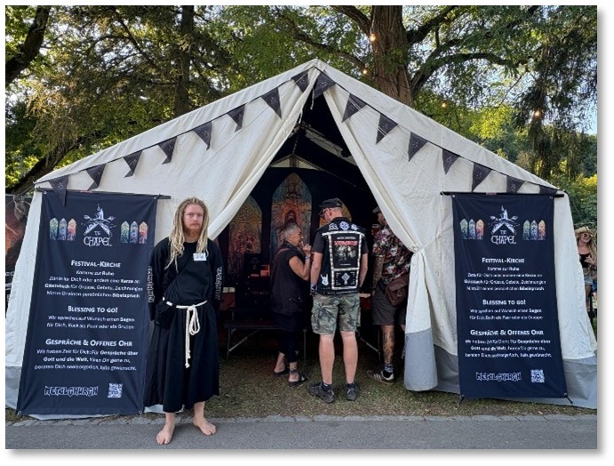 Betreut wurde die Kapelle von jeweils zwei Person aus der Metalchurch in schwarzen Mönchsroben. Sie drängten sich niemandem auf, waren aber jederzeit bereit, Besuchenden zuzuhören, oder auf Wunsch mit- oder für die Menschen zu beten, oder einen individuellen Segen für Einzelpersonen, Paare oder Gruppen zu sprechen. Ausserdem waren der Metalpfarrer oder die Sozialkiakonin ebenfalls häufig am Stand.