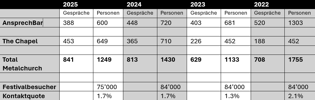 Über die drei Festivaltage verteilt registrierten wir in der Kapelle 309 Begegnungen mit total 534 Besuchenden. Nicht erfasst sind die unzähligen «Sich-Grüssen» und freundlichen Nicken beim Vorbeilaufen der Gäste. Die kurzen Gespräche vor der Kapelle drehten sich dabei mehrheitlich um die Fragen, «was ist das hier?» «Was macht ihr hier?» «Seid ihr wirklich Kirche?». Dass die Kapelle eine Wirkung hat, zeigte sich dadurch, dass Besuchende die Kapelle wie eine «Wegkapelle» betraten, sich bekreuzigten, oder ein stilles Gebet sprachen, und weiterzogen. Es ergaben sich über das gesamte Festival verteilt mehr als 50 Gespräche von längerer Dauer, also 15min bis 2h mit seelsorgerlichem und/oder theologischem Inhalt. Die Möglichkeit ins Buch zu schreiben, wurde rege genutzt, nicht selten in Kombination mit dem Anzünden einer Kerze, zum Beispiel als Zeichen für einen verstorbenen Freund und Festivalkollegen. Das Metalchurch-Team umfasste dreizehn Personen, davon zwei Angestellte (Metalpfarrer und Diakonin) sechs freiwillige Seelsorgende und fünf Personen, ebenfalls freiwillig für Logistik, Auf- & Abbau.